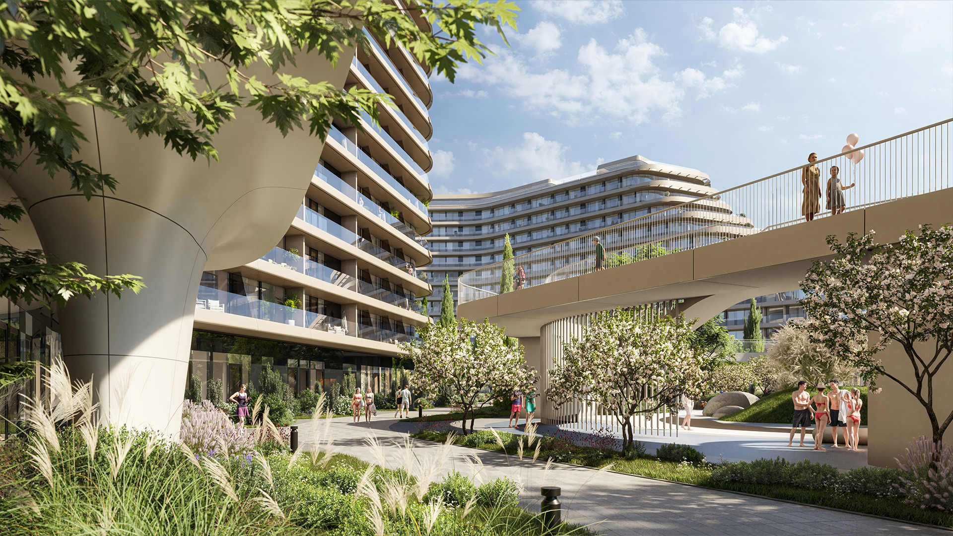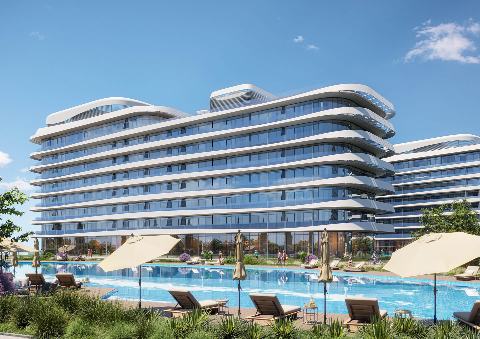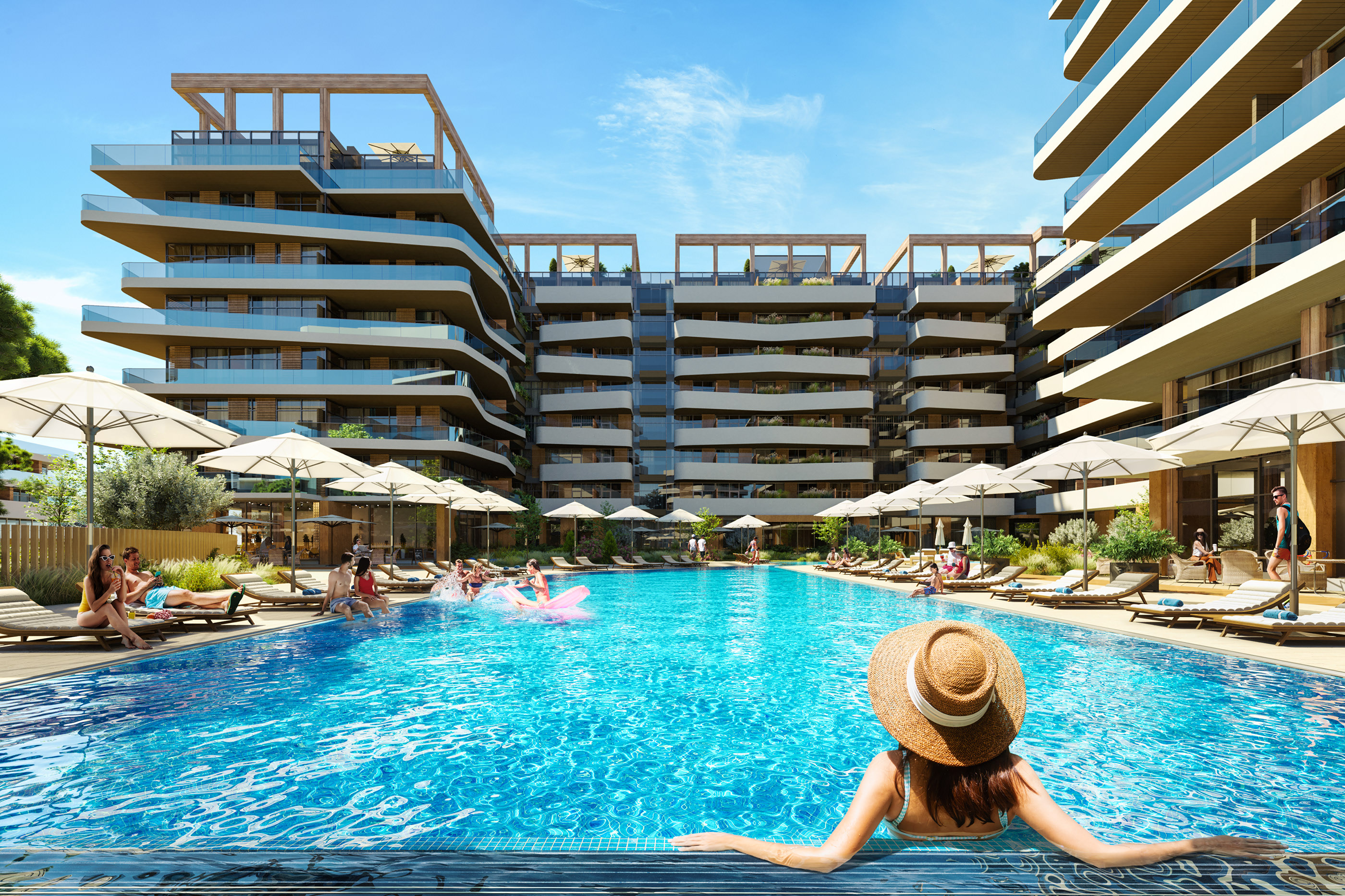 ● На территории комплекса — бассейны с подогревом, СПА-комплекс, детские и спортивные площадки, кафе и рестораны, медицинский центр, кинотеатр, коворкинг, термальные источники и многое другое.