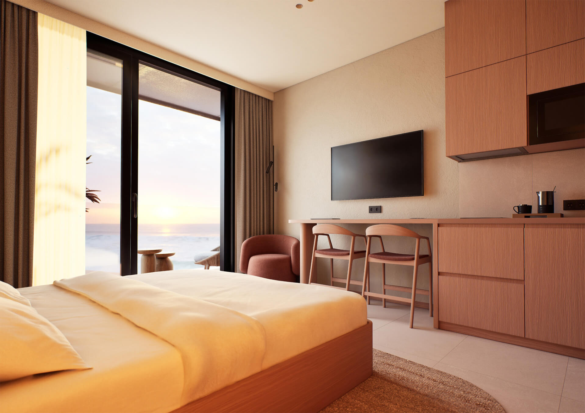 Проект предлагается как готовый бизнес: для апартаментов предусмотрено несколько типовых дизайн‑решений на выбор. Управляющая компания возьмет на себя все заботы по сдаче и обслуживанию номеров.